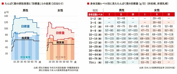 では実際にどのぐらいたんぱく質を摂取すればいいのか。たんぱく質の食事摂取基準には『推定平均必要量』『推奨量』『目標量』があり、年齢や性別によって異なる。