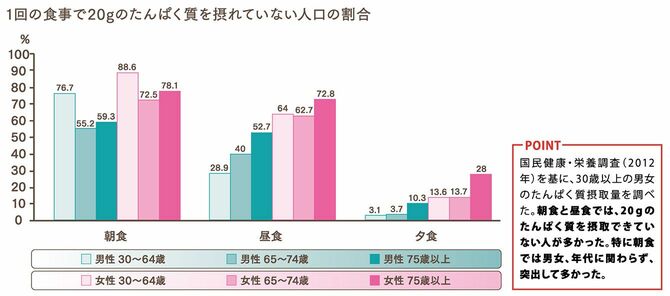 だが、国民健康・栄養調査をもとに、30歳以上の男女のたんぱく質摂取量を調べると、朝食と昼食で20gのたんぱく質を摂取できていない人が多く、特に朝食でのたんぱく質摂取が突出して不足していることがわかる。