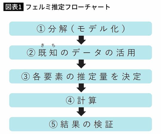 図表1は、フェルミ推定を行う手順をフローチャートにまとめたものです。実際に例題を解きながら説明します。