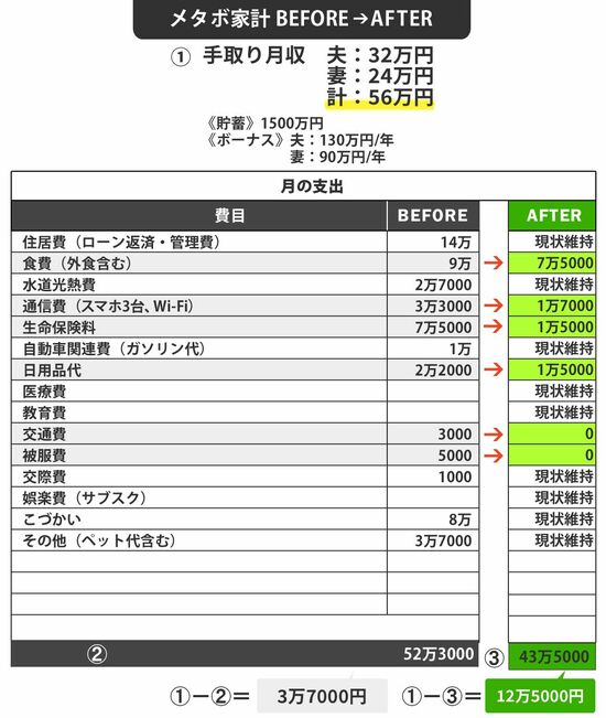 最大の支出は月14万円の住宅ローンですが、これは削れません。目をつけたのは、生命保険です。貯蓄型の変額保険を死亡保障も兼ねて加入していたのですが、自分たちに必要な保障を再考して最低限の医療保険に切り替え、一気に6万円をカットしました。そして、食費と通信費は各1万5000円程度減らし、その他日用品などの変動費も数千円ずつ削り、月計10万6000円を大幅にカットできました。