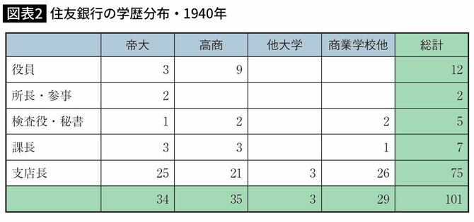 次いで、商業学校卒が42人(12.7%)と異様に多い点についてであるが、1940年の三菱財閥では253人のうち、商業学校卒が10人(4.0%)、三井財閥は350人のうち10人(2.9%)で、商業学校に類する師範学校卒などの3人を加えても13人(3.7%)に過ぎない。両者に比べて、住友財閥における商業学校卒の人数は他を圧倒している。