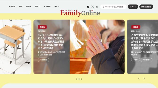 「塾・習い事」「英語」「算数」「中学受験」「小学校受験」「医学部進学」など、最新の教育事情や受験トレンドを深掘りすると同時に、「食育」「健康」「レジャー」「生活環境」など、家庭の暮らしをより豊かにする情報もお届け。子育てを楽しむすべてのご家庭をサポートしていきます。「プレジデントFamily Online」にぜひご期待ください。
