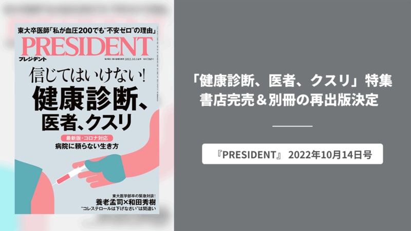 PRESIDENT「健康診断、医者、クスリ」の特集で書店完売&別冊の再出版決定!【2022年10月14日号】